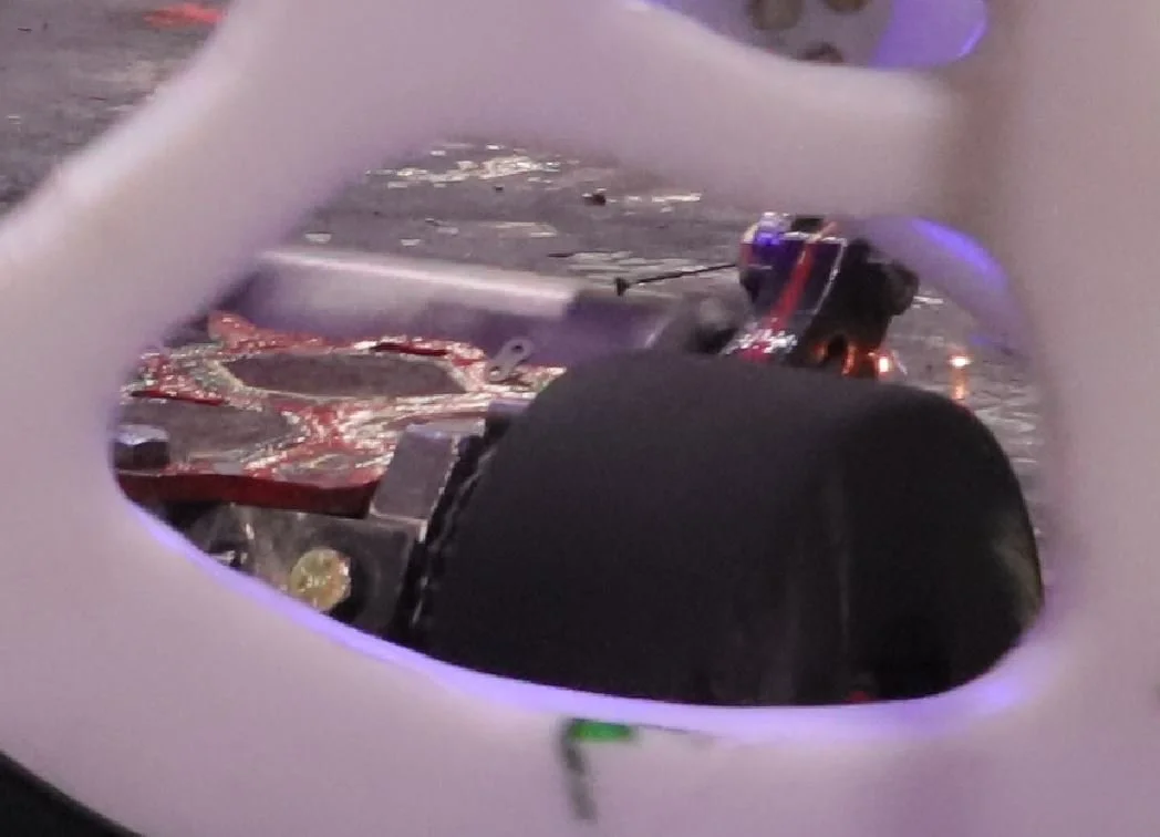 As far as we can remember, nobody had ever tried this strategy against a HUGE-style robot before. We needed to make a new plan, and fast. HUGE was already assembled, through tech check, and ready to fight. We couldn’t make any changes to the robot itself without risking a long delay, which could be fatal on its own in a day where we (ideally) could be fighting twice. Ultimately, we decided to try to avoid the drum and aim for the wheels, as well as resolving to take any opportunities to spin downwards on Copperhead that we could find. From that orientation, it should negate the worst of the energy transfer from a weapon-to-weapon hit, even though it also comes with other tradeoffs.