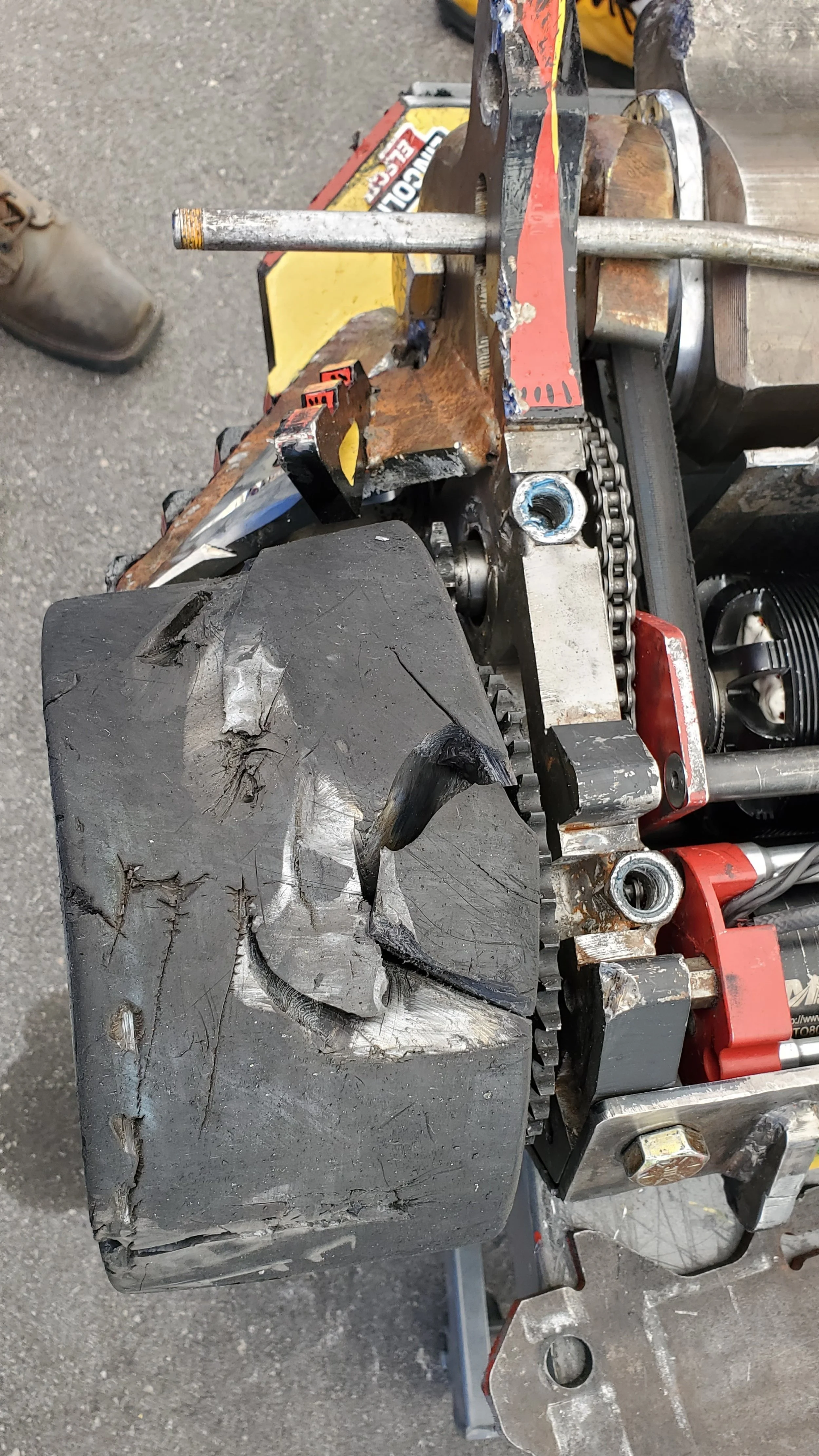 Damage to HUGE was minimal, mostly limited to the tips of the blade being extremely mashed up from hitting a robot as solid as Copperhead. We intended to run a different blade for fighting Sawblaze anyhow, so we were able to set it aside and focus on other preparations. Otherwise we went through our regular processes to prepare HUGE after a fight, and were lucky enough to not have greater damage to fix in such a short amount of time.